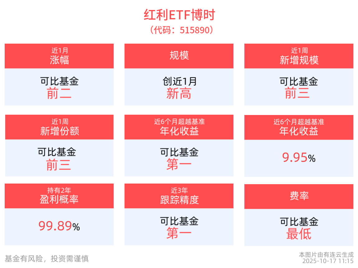 截至2025年10月17日 11:15,中证红利指数上涨0.18%,成分股陕天然气上涨3.46%,兖矿能源上涨2.70%,皖通高速上涨2.47%,龙佰集团上涨2.31%,江苏金租上涨2.24%。红利ETF博时(515890)上涨0.13%,最新价报1.49元。拉长时间看,截至2025年10月16日,红利ETF博时近1周累计上涨2.62%,涨幅排名可比基金2/6。